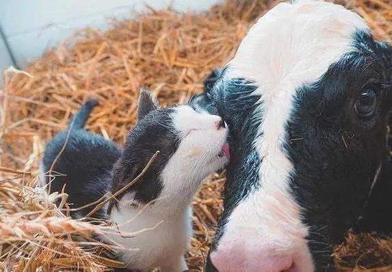 第二天,牛棚里多了个“小家伙”。饲养员远远一看,以为是头小乳牛,围着大乳牛转悠,还亲昵地舔来舔去。他走近一瞧,乐了:哪是什么小乳牛,分明是只猫!这只猫身上黑白相间的花纹,跟乳牛的皮毛一模一样,乍看还真像一家人。不仅饲养员看花了眼,连那头乳牛也“认错”了,把这只猫当自己娃,舔它、护它,眼神里满是疼爱。